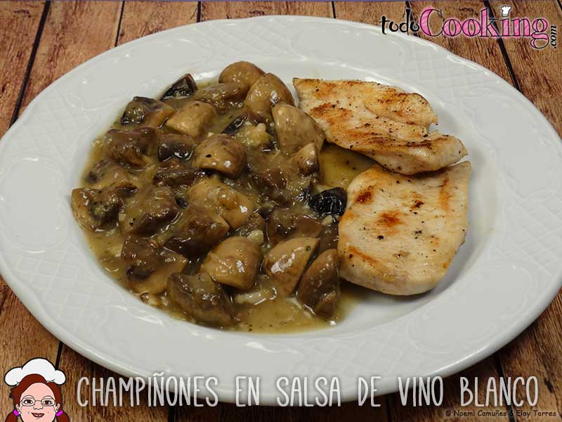Aún podemos encontrar champiñones y setas frescas en el mercado, así que para aprovechar lo que queda de temporada, hoy comemos unos champiñones en salsa de vino blanco que nos servirán de guarnición de lujo de unos filetes de pollo a la plancha.