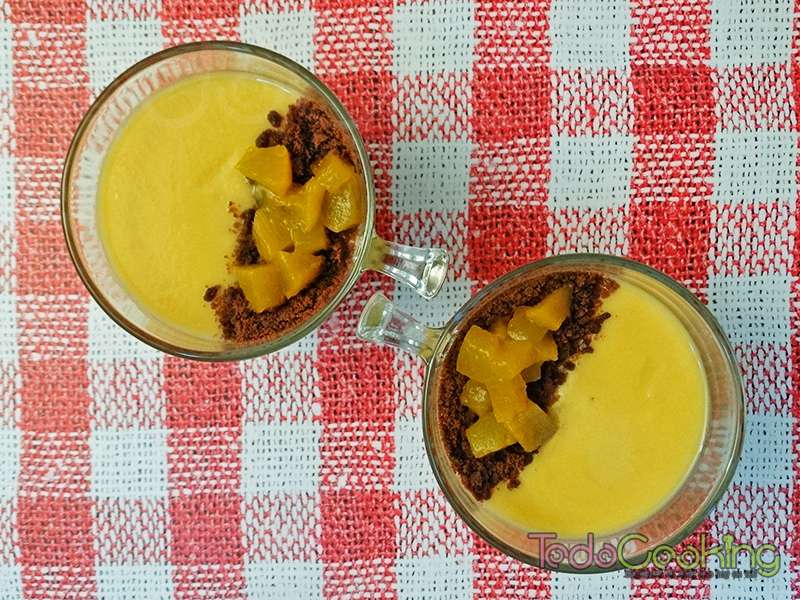 Natillas con melocotón en almíbar. Postre tradicional.