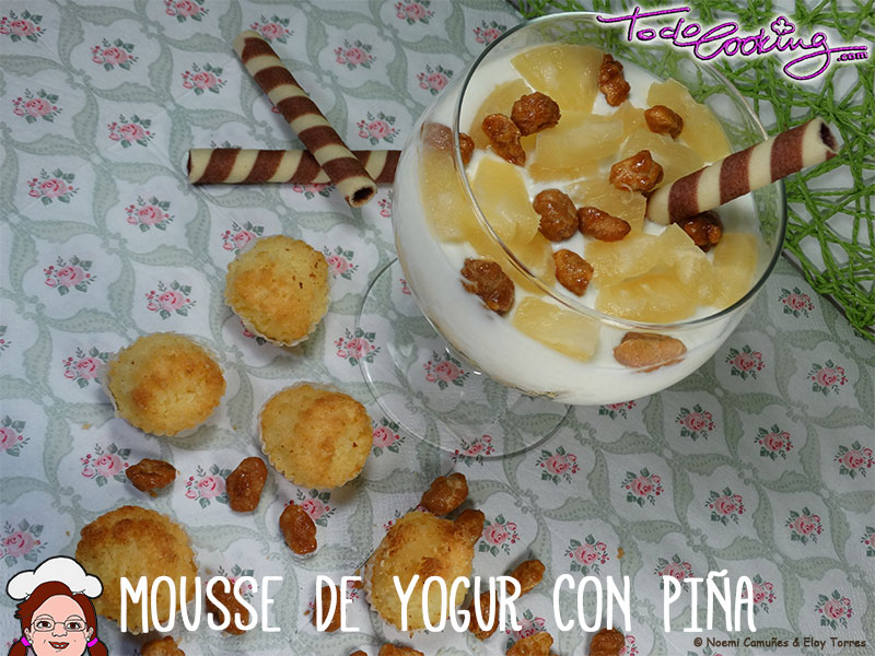 - Montar el postre en copas o vasos, colocar en el fondo un poco de las migas de coquitos, encima la mousse de yogur, los dados de piña y algunos cacahuetes garrapiñados al gusto.
