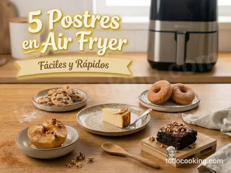En este recopilatorio encontrarás 5 postres en Air Fryer fáciles y rápidos, perfectos para cuando quieres darte un capricho sin complicarte. Desde un brownie jugoso hasta donuts esponjosos o una tarta de queso cremosa, todas las recetas están pensadas para que salgan bien a la primera.
