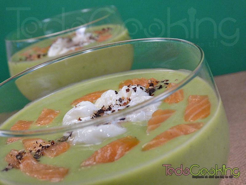 Crema fría de guisantes y coco con huevo poché